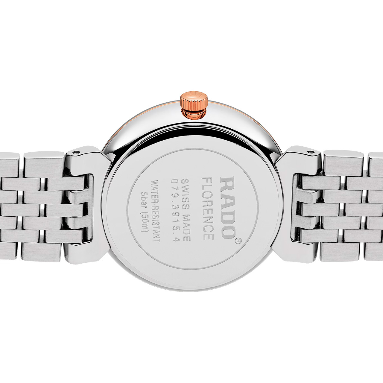 Корпус: Нержавеющая сталь с частичным PVD-покрытием розового золота. Металлик циферблат с золотистыми стрелками и часовыми индексами, декорирован 4 бриллиантами. Инновационное металлизированное сапфировое стекло. Рифленая заводная головка. Диаметр 30 мм. Водонепроницаемость 50 метров.