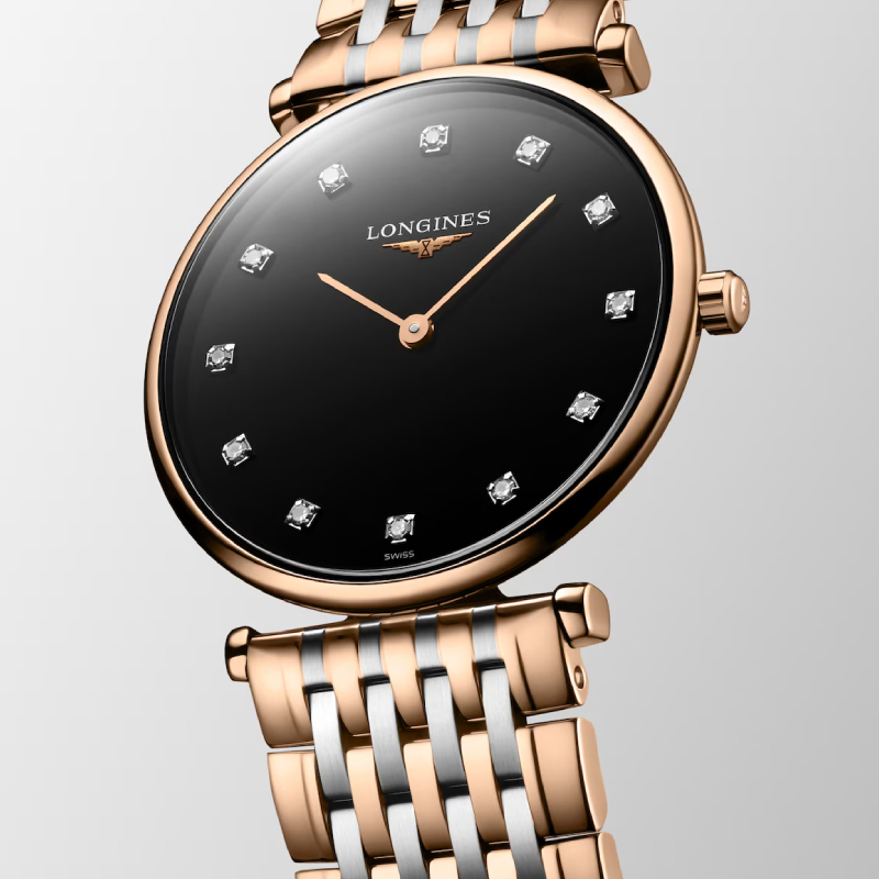 Корпус: Нержавеющая сталь + PVD-покрытие из розового золота, сапфировое стекло, 12 бриллиантов на циферблате. Размер 29 мм, водонепроницаемость 30 метров. Циферблат – черный.