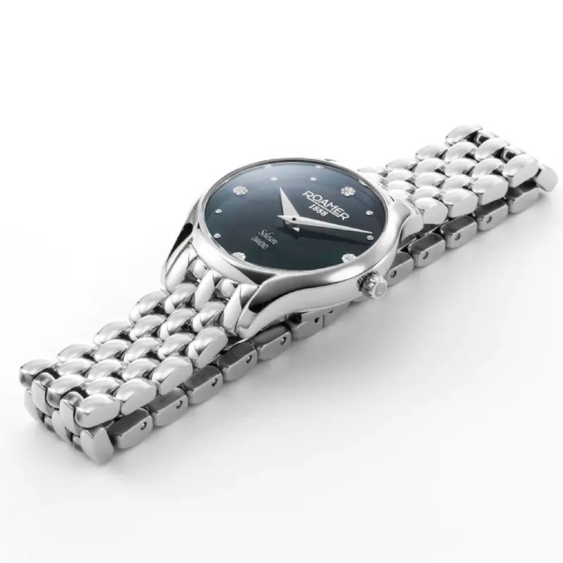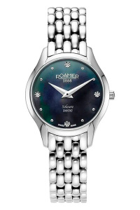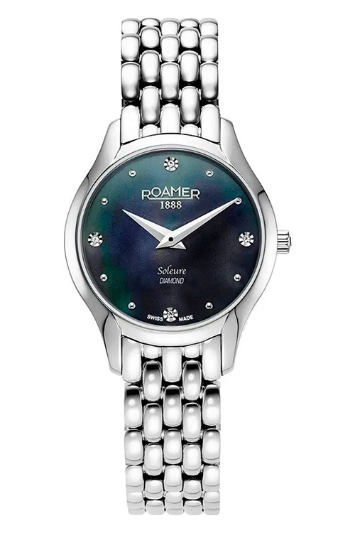 Корпус: Корпус выполнен из высококачественной нержавеющей стали 316L. Перламутровый циферблат чёрного цвета декорирован бриллиантами, серебристые стрелки и часовые индексы. Сапфировое стекло с антибликовым покрытием. Диаметр: 30 мм. Водозащита: 30 м.