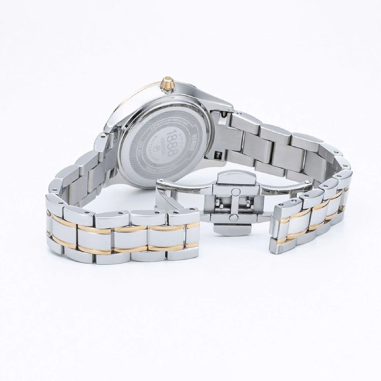 Корпус: Корпус изготовлен из высококачественной нержавеющей стали, марки 316L с частичным PVD - покрытием жёлтого золота. Черный перламутровый циферблат. Накладные точечные часовые индексы и стрелки выполнены из полированной стали с позолотой. На каждом циферблате в положении «12 часов» расположен уникальный бриллиант. Сапфировое стекло с антибликовым покрытием защищает циферблат от царапин и обеспечивает отличную читаемость при любом освещении. Рифлёная заводная головка. Диаметр: 30 мм. Водонепроницаемость: 50 метров.