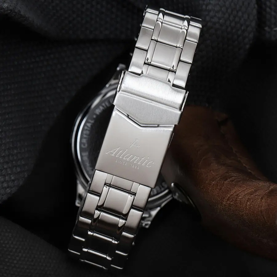 Ремешок: Браслет из нержавеющей стали, поверхности с матовой шлифовкой - сатинированием и полировкой. Браслетная раскладывающаяся застежка с дополнительным защитным фиксатором, гравировка с названием марки и ее эмблема.