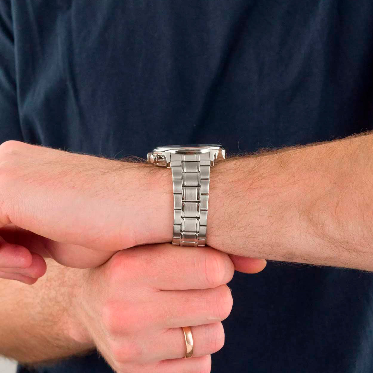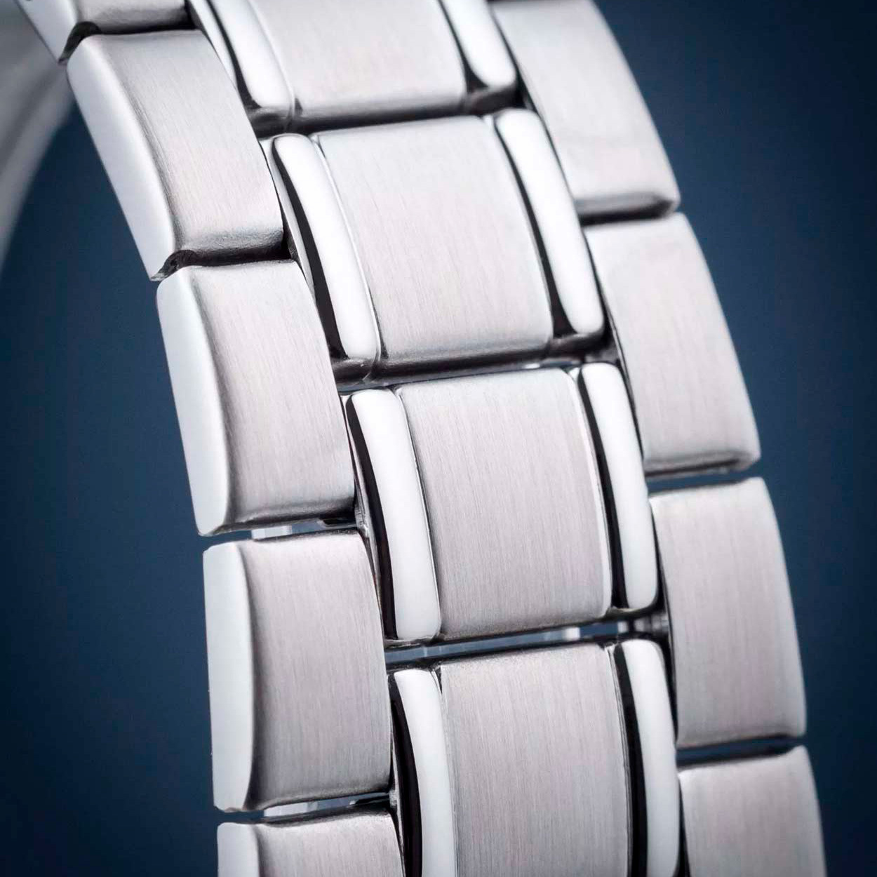 Ремешок: Браслет из нержавеющей стали, поверхности с матовой шлифовкой - сатинированием и полировкой. Браслетная раскладывающаяся застежка с дополнительным защитным фиксатором, гравировка с названием марки и ее эмблема.