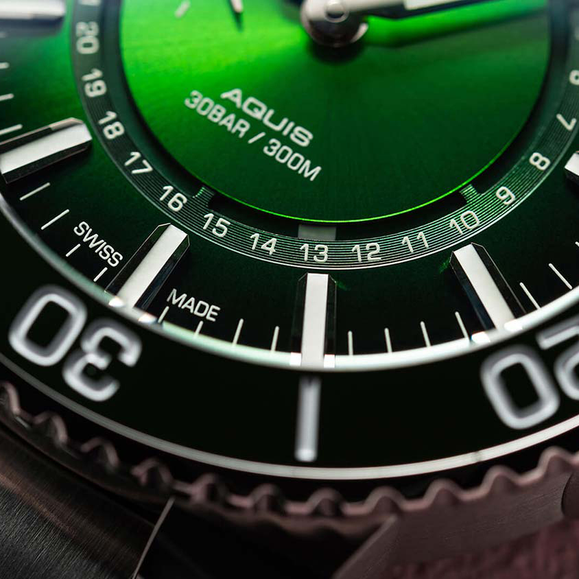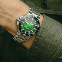 Корпус: Многокомпонентный корпус из нержавеющей стали. Керамический безель с минутной шкалой вращается в одном направлении. Циферблат выполнен по технологии Sunray (солнечные лучи) зелёного цвета. Сапфировое стекло, выпуклое с обеих сторон, внутреннее антибликовое покрытие. Индексы и стрелки покрыты составом Superluminova. Завинчивающаяся задняя крышка со специальной гравировкой. Завинчивающаяся заводная головка из нержавеющей стали. Диаметр: 43,5 мм. Водонепроницаемость: 300 метров.