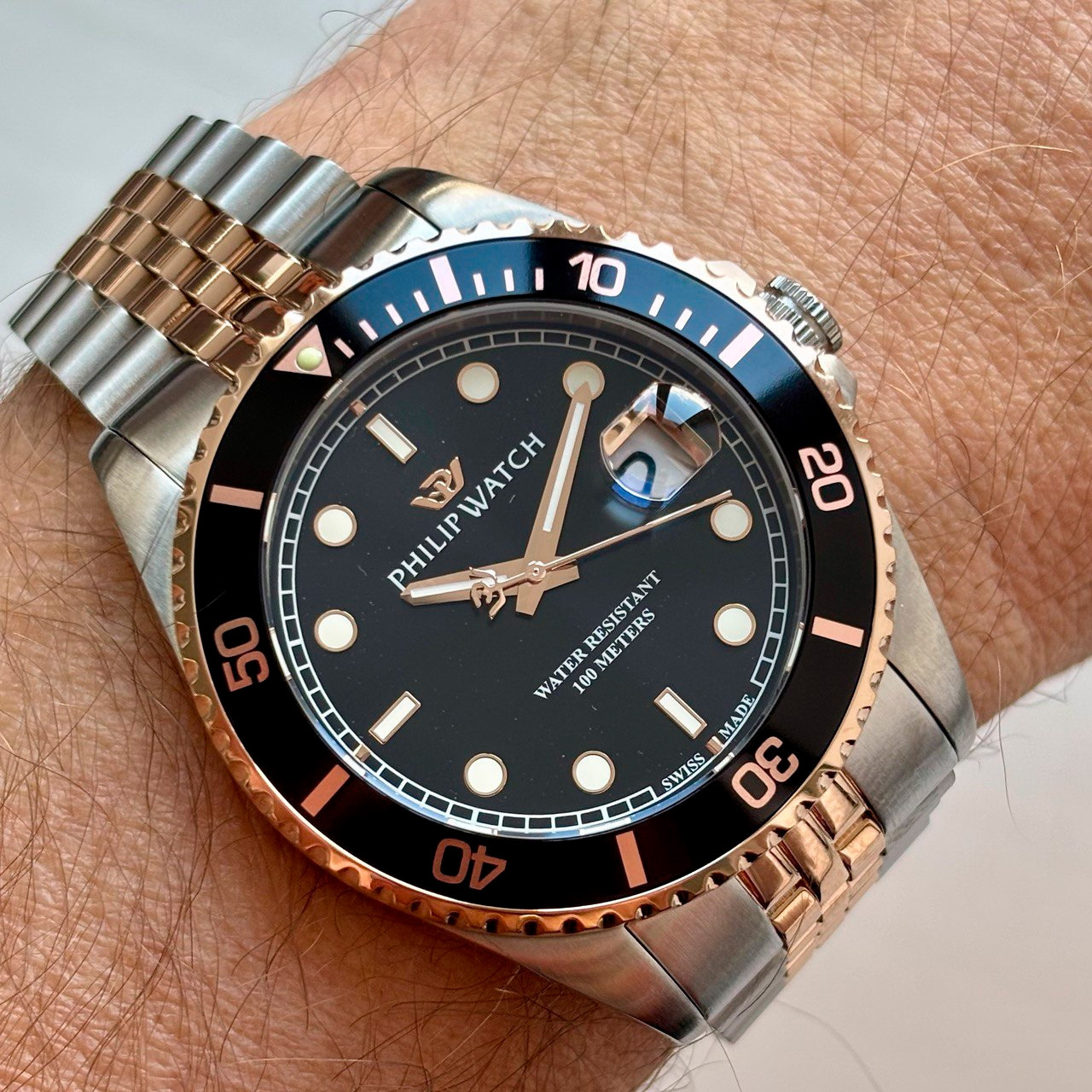Корпус: Корпус выполнен из высококачественной стали с повышенной устойчивостью к коррозии, поверхности с матовой шлифовкой – сатинированием и полировкой до зеркального блеска с частичным PVD покрытием. Однонаправленный безель вращается со щелчками в направлении против хода стрелок. Циферблат чёрного цвета. Люминесцентный состав на стрелках и на разметке циферблата. Сапфировое стекло, это лучшее стекло для наручных часов, которое не царапается при механическом воздействии, его можно повредить только алмазом. Диаметр корпуса: 42 мм. Водозащита до 100 метров позволит плавать.