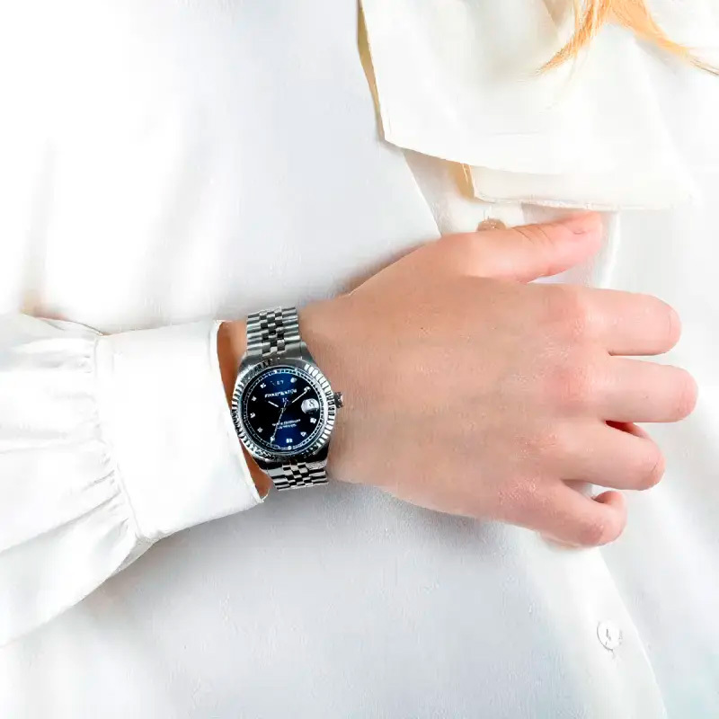 Корпус: Корпус выполнен из высококачественной стали с повышенной устойчивостью к коррозии, поверхности с матовой шлифовкой – сатинированием и полировкой до зеркального блеска. Циферблат глубокого синего цвета с шлифовкой “солнечные лучи" украшен 10 бриллиантами. Люминесцентный состав на стрелках. Сапфировое стекло, это лучшее стекло для наручных часов, которое не царапается при механическом воздействии, его можно повредить только алмазом. Диаметр корпуса: 35 мм. Водозащита до 100 метров позволит плавать.