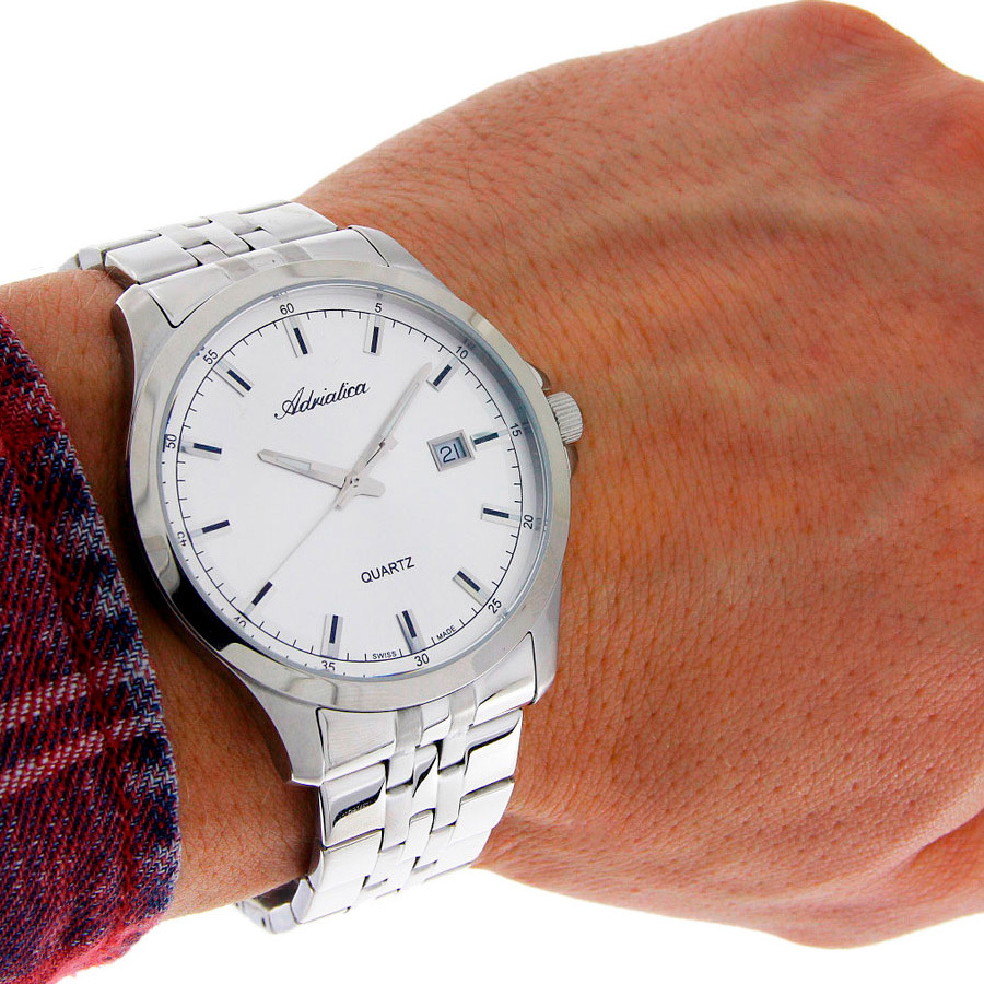 Корпус: Круглый корпус выполнен из полированной нержавеющей стали. Серебристый циферблат. Накладные часовые индексы и стрелки выполнены из стали с покрытием SuperLuminova, которое обеспечивает подсветку в темное время суток. Минеральное стекло. Диаметр корпуса составляет 42 мм, толщина 8 мм. Водостойкость WR 50 (мытье рук, дождь).