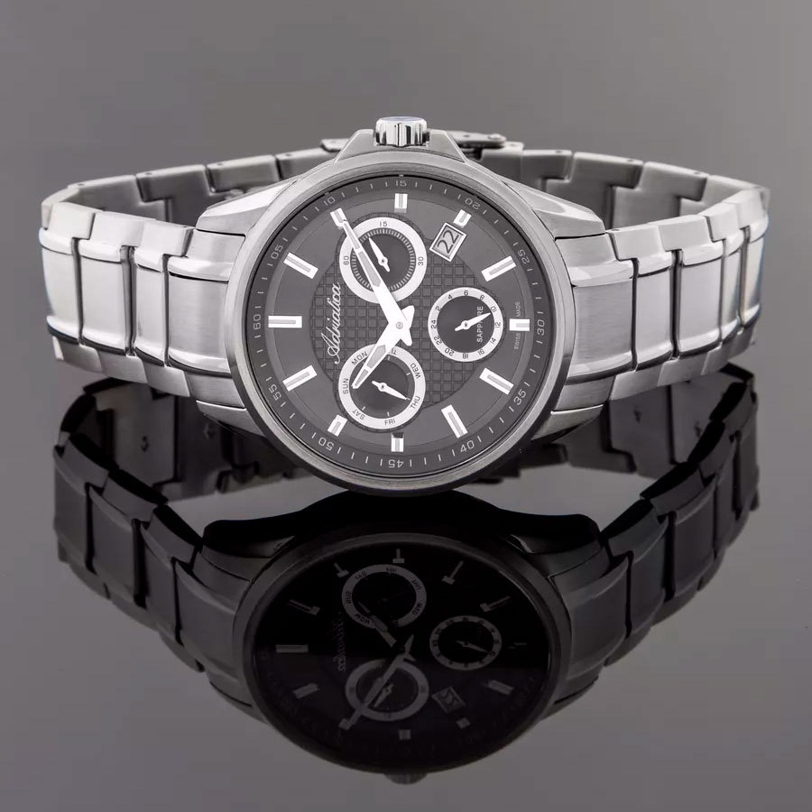 Функции: Центральные часовая и минутная стрелки, секундная стрелка вынесена на отдельный циферблат. Дата, день недели. 12-ти и 24-х часовой формат отображения времени.