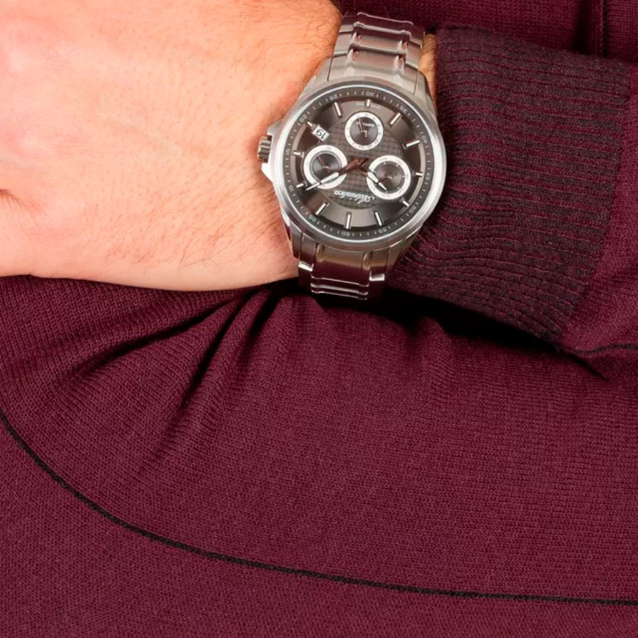 Корпус: Круглый корпус выполнен из полированной нержавеющей стали. Чёрный циферблат с узором гильоше. Накладные часовые индексыв выполненый из стали. Стрелки с покрытием SuperLuminova, которое обеспечивает подсветку в темное время суток. Сапфировое стекло устойчивое к возникновению царапин. Диаметр корпуса составляет 46 мм, толщина 11 мм. Водостойкость WR 50 (мытье рук, дождь).