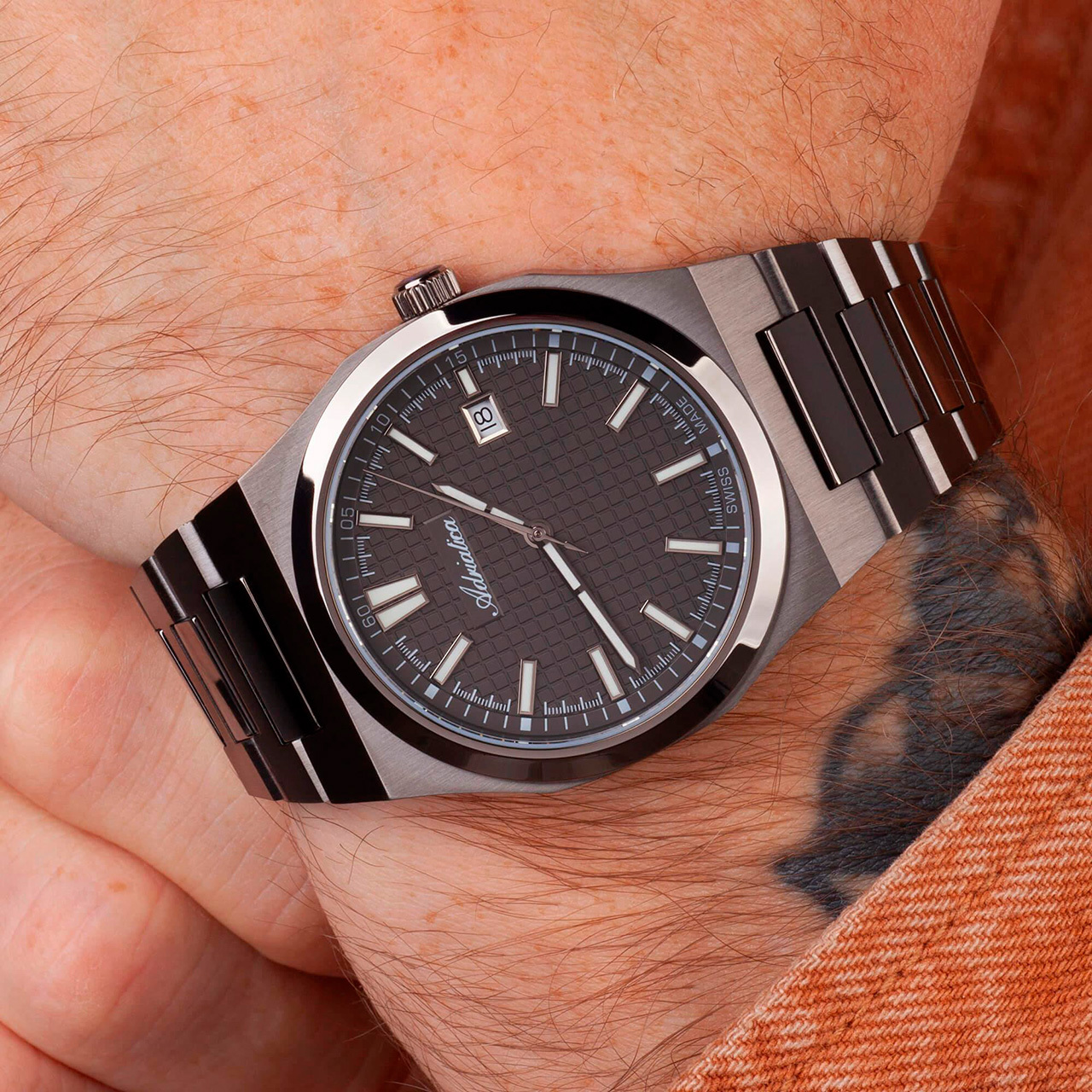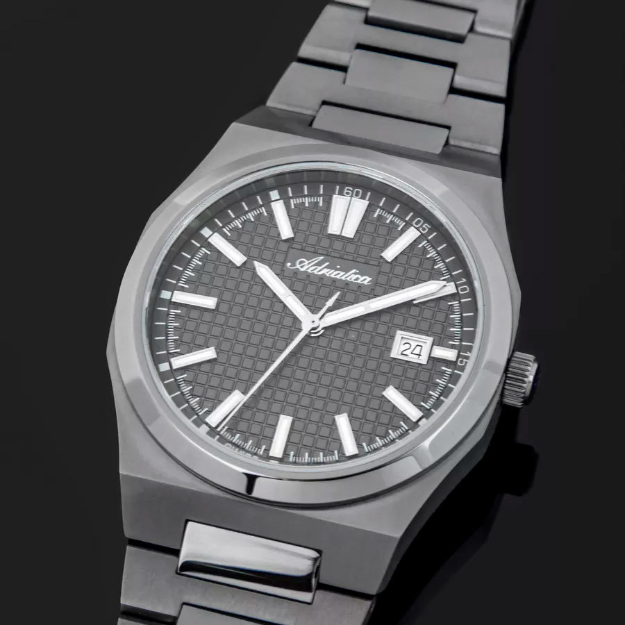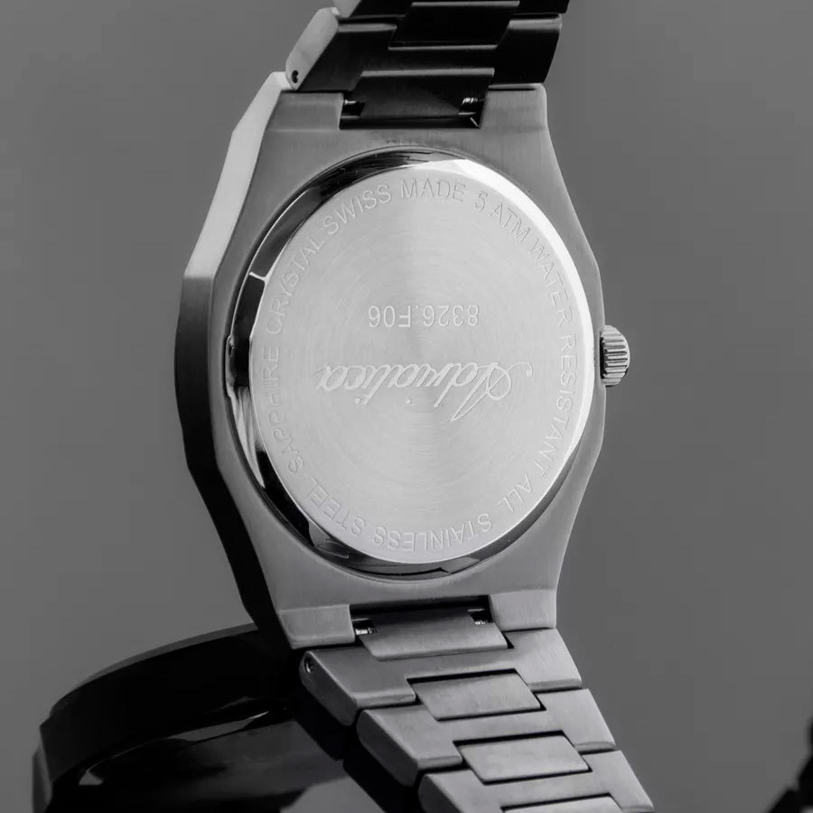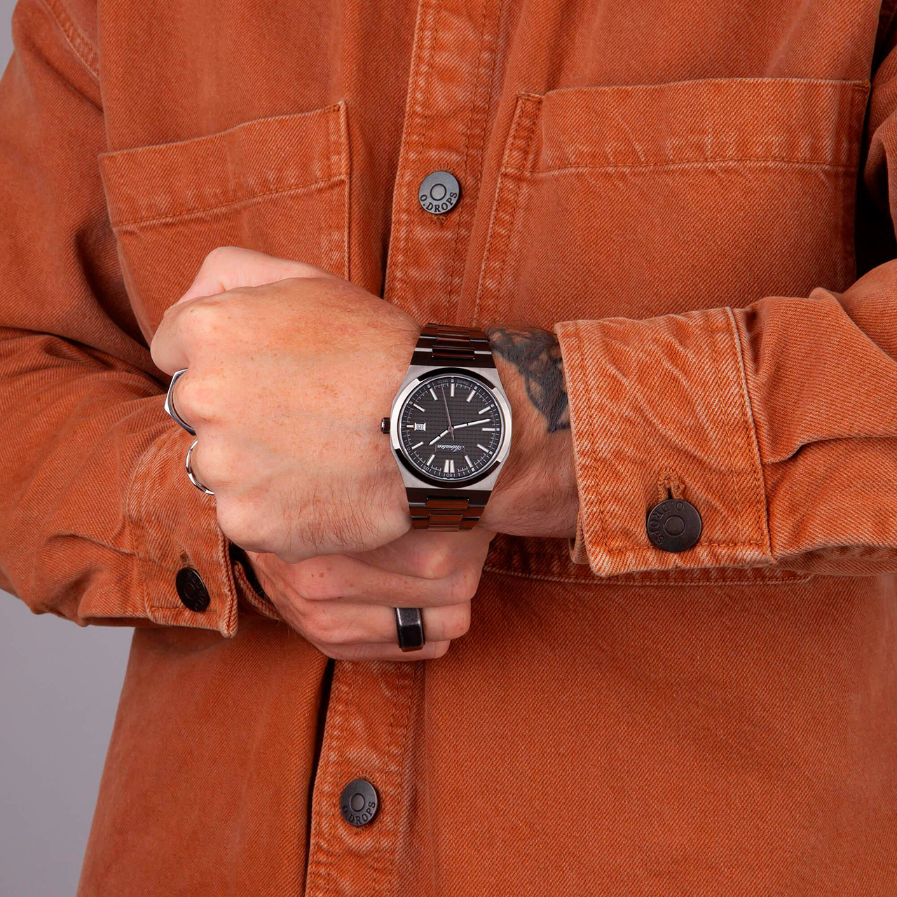 Корпус: Круглый корпус выполнен из полированной нержавеющей стали с PVD покрытием чёрного цвета. Чёрный циферблат с узором гильоше. Накладные часовые индексыв и стрелки выполненый из стали, с покрытием SuperLuminova, которое обеспечивает подсветку в темное время суток. Сапфировое стекло устойчивое к возникновению царапин. Диаметр корпуса составляет 40 мм, толщина 10 мм. Водостойкость WR 50 (мытье рук, дождь).