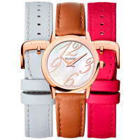 Корпус: Нержавеющая сталь с PVD - покрытием цвета розового золота. Циферблат перламутровый с позолоченными стрелкамии и часовыми индексами. Циферблат защищен высокопрочным сапфировым стеклом. Заводная головка украшена камнем в форме кабошона. Диаметр: 31 мм. Водостойкость: 50 м.
