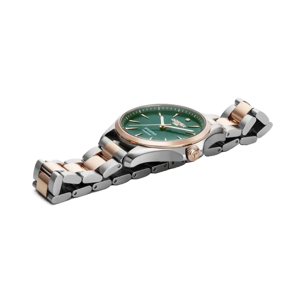 Корпус: Корпус выполнен из высококачественной нержавеющей стали 316L с полировкой и матовой шлифовкой - сатинированием с частичным IP покрытием. Перламутровый циферблат зелёного цвета декорирован 1 бриллиантом, золотистые стрелки и часовые индексы. Стрелки с люминесцентным покрытием для оптимальной разборчивости в условиях низкой освещенности. Сапфировое стекло с антибликовым покрытием. Диаметр: 36 мм. Водозащита: 50 м.