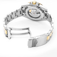 Корпус: Корпус выполнен из высококачественной нержавеющей стали 316L с частичным покрытием жёлтого золота. Цвет безеля для дайвинга, изготовленного из высококачественной устойчивой к царапинам керамики, соответствует цвету циферблата. Чёрный циферблат, позолоченные стрелки и часовые индексы с люминесцентным покрытием Super-LumiNova для оптимальной разборчивости в условиях низкой освещенности. Сапфировое стекло с антибликовым покрытием. Завинчивающаяся заводная головка с защитой. Прозрачная задняя крышка позволяет увидеть сложный механизм. Диаметр: 42 мм. Водозащита: 200 м.