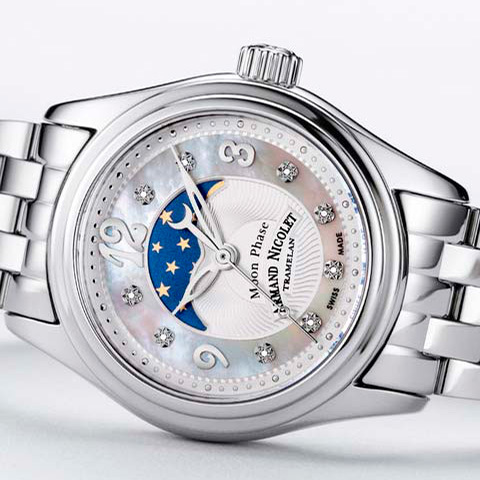 Корпус: Нержавеющая сталь. Перламутровый светлый циферблат, украшен декоративным узором - гильоше. Сапфировое стекло, устойчивое к механическим повреждениям. Механизм усложнен функцией – индикатором фазы луны, расположенной в районе двенадцатичасовой отметки. Диаметр 34 мм. Водозащита 100 м.