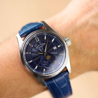 Корпус: Нержавеющая сталь. Синий циферблат, украшен декоративным узором - гильоше. Рифленая заводная головка. Сапфировое стекло с антибликовым покрытием, устойчивое к механическим повреждениям. Прозрачная задняя крышка. Диаметр 42 мм. Водозащита 100 м.