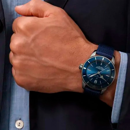 Корпус: Корпус из полированной стали, синий зубчатый вращающийся безель с индексами. Синий циферблат, ретро логотип бренда, стрелки с крупными люминесцентными вставками, полированные минутные индексы. Выпуклое сапфировое стекло с двусторонним антибликовым покрытием. Диаметр 44 мм. Водонепроницаемость 200 м.