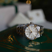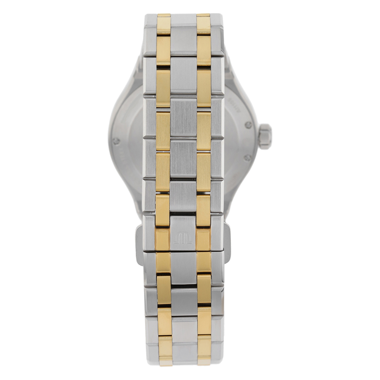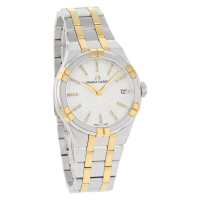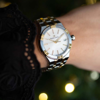 Корпус: Круглый корпус выполнен из нержавеющей стали 316L, поверхность с матовой шлифовкой сатинированием и глянцевой полировкой до зеркального блеска. Выступы безеля с PVD покрытием цвета жёлтого золота. Циферблат из натурального перламутра. Аппликация часовых индексов и стрелки с алмазной огранкой имеют золотое покрытие и полировку до зеркального блеска. Часовые индексы украшены бриллиантами. Стрелки с люминесцентным покрытием Super-Luminova, которое светится в темноте после непродолжительной зарядки на свету. Сапфировое стекло с антибликовым покрытием защищает циферблат от царапин и обеспечивает отличную читаемость при любом освещении. Завинчивающаяся заводная головка с фирменным логотипом. Диаметр корпуса составляет: 35 мм. Водостойкость: 10 ATM.