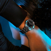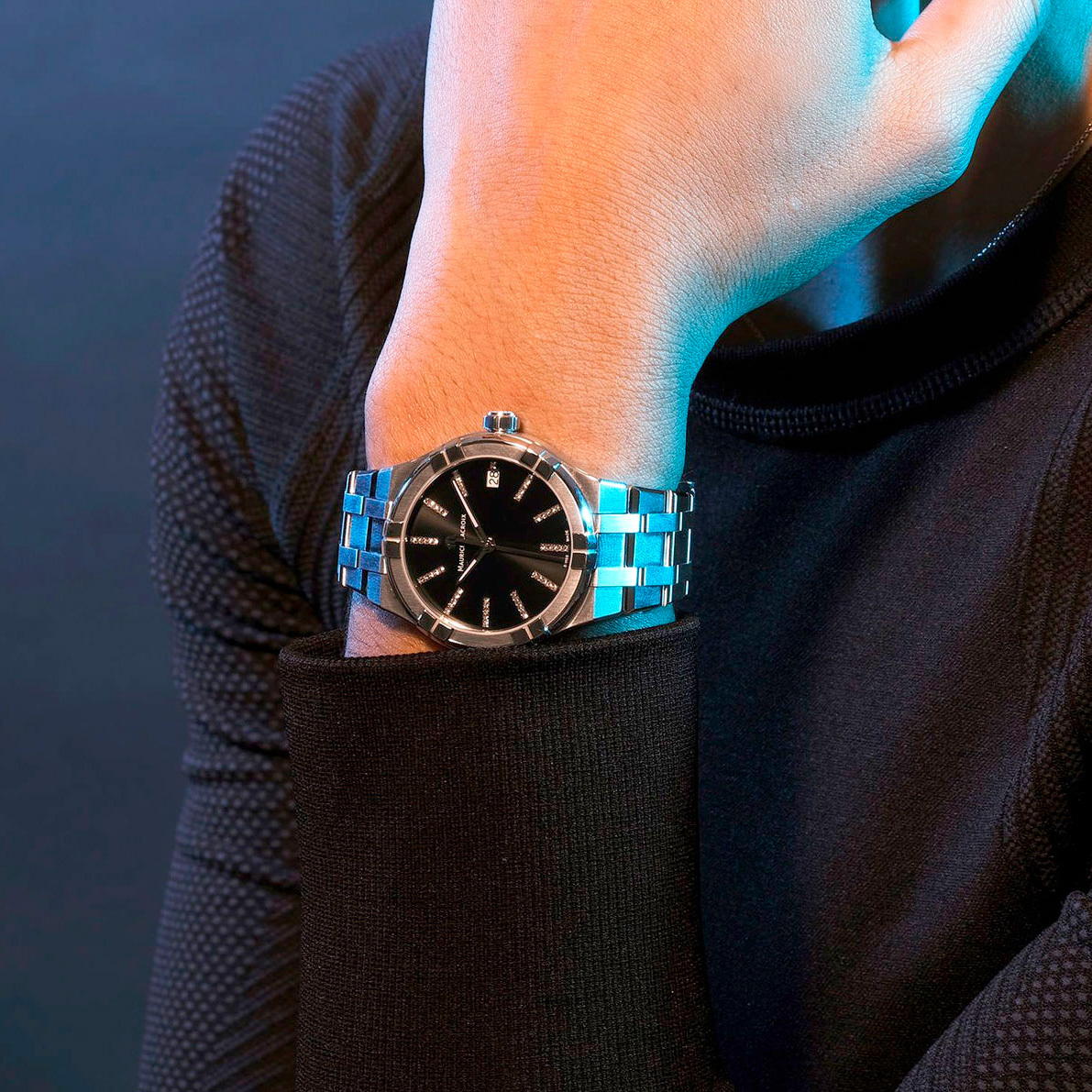 Корпус: Круглый корпус выполнен из нержавеющей стали, поверхности с матовой шлифовкой сатинированием и глянцевой полировкой. Циферблат черного цвета с шлифовкой "солнечные лучи". Аппликация часовых индексов и стрелки с алмазной огранкой имеют полировку до зеркального блеска. Часовые индексы украшены бриллиантами. Фотолюминесцентный состав SLN на стрелках, светящийся в темноте. Сапфировое стекло с антибликовым покрытием. Диаметр корпуса составляет 35 мм. Водостойкость 10 ATM.