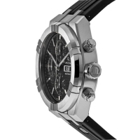 Корпус: Круглый корпус выполнен из нержавеющей стали 316L, поверхность с матовой шлифовкой сатинированием и глянцевой полировкой до зеркального блеска. Циферблат глубокого черного цвета с гильошированием в стиле «клетка», вспомогательные индикаторы хронографа с гильошированием в виде концентрических кругов. Аппликация часовых индексов и стрелки с алмазной огранкой имеют родиевое покрытие и полировку до зеркального блеска с люминесцентным покрытием Super-Luminova, которое светится в темноте после непродолжительной зарядки на свету. Сапфировое стекло с антибликовым покрытием защищает циферблат от царапин и обеспечивает отличную читаемость при любом освещении. Завинчивающаяся заводная головка с фирменным логотипом. Диаметр корпуса составляет: 44 мм. Водостойкость: 20 ATM.