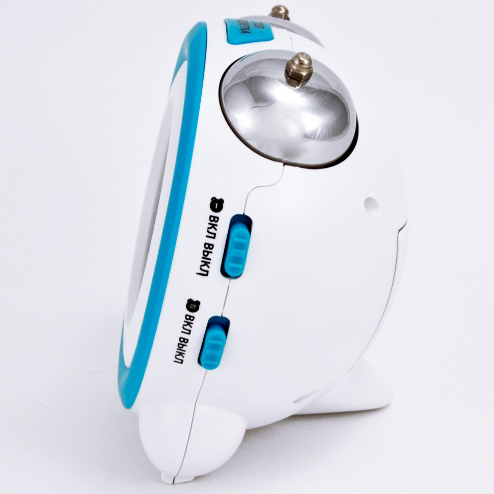Материал и цвет: Корпус будильника изготовлен из качественного ABS пластика голубого и белого цвета. Стекло – пластиковое.