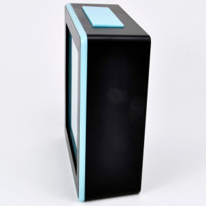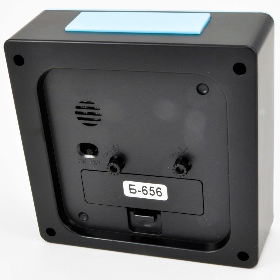 Материал и цвет: Корпус будильника квадратной формы сделан из чёрного пластика со вставкой голубого цвета. Стекло – пластиковое. Белый циферблат с чёрными арабскими цифрами.