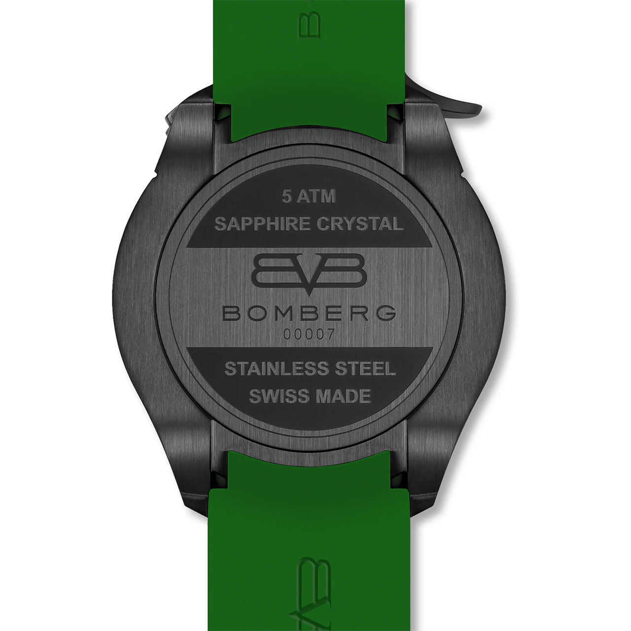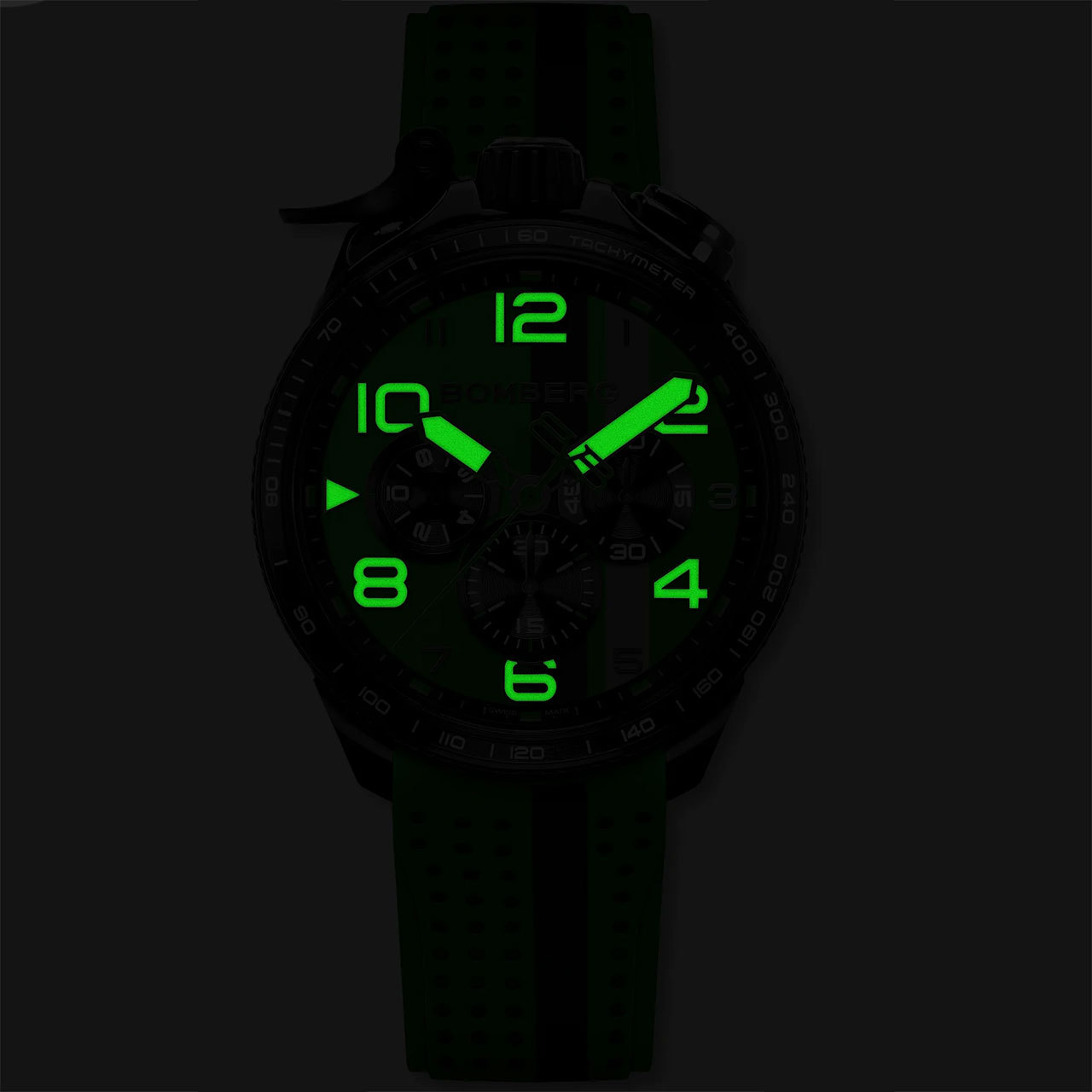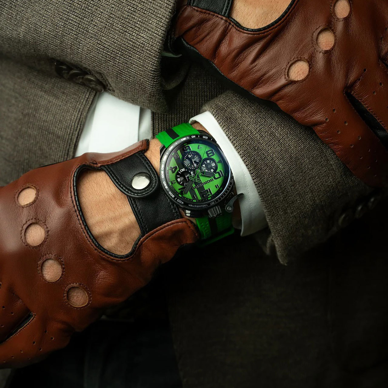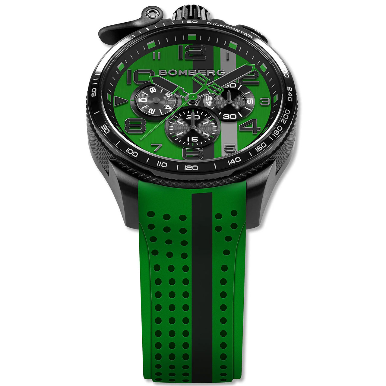 Корпус: Круглый корпус выполнен из нержавеющей стали марки 316L. Стойкое к царапинам PVD покрытие черного цвета. Черный алюминиевый безель тахометра. Зелёный циферблат. Уникальный дизай с завинчивающейся заводной головкой в положении «12 часов», кнопкой в положении «1» и рычагом в положении «11» вдохновлен искусством автоспорта и гонок. Аппликация часовых индексов и стрелки с покрытием Super-Luminova®. Сапфировое стекло с антибликовым покрытием. Диаметр корпуса 45 мм, толщина - 13 мм. Водостойкость 50 метров.