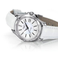 Корпус: Корпус из нержавеющей стали. Белый перламутровый циферблат украшен узором "гильоше", три бриллианта на "12 часов". Стрелки и риски серебристого цвета. Сапфировое стекло с антибликовым покрытием. Диаметр 32 мм. Водостойкость 100 м. Система DS.