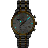Функции: Индикация часов, минут при помощи центральных стрелок. Хронограф с 12-ти часовым, 60-ти секундным и 30-ти минутным счетчиками, индикация фазы луны и лунного цикла, индикация даты на "4" часа, вынесенная секундная стрелка на "6" часов.