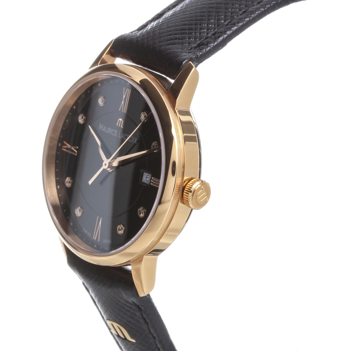 Корпус: Корпус сталь с PVD покрытием. Чёрный циферблат с золотистыми стрелками, украшен 8 бриллиантами. Сапфировое стекло. Диаметр 30 мм. Водонепроницаемость 50 метров.