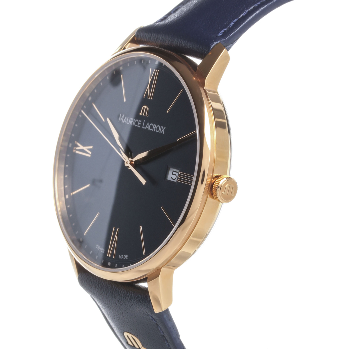 Корпус: Нержавеющая сталь с PVD покрытием золотом розового цвета. Синий циферблат с золотистыми стрелками. Сапфировое стекло. Диаметр 40 мм. Водонепроницаемость 50 метров.