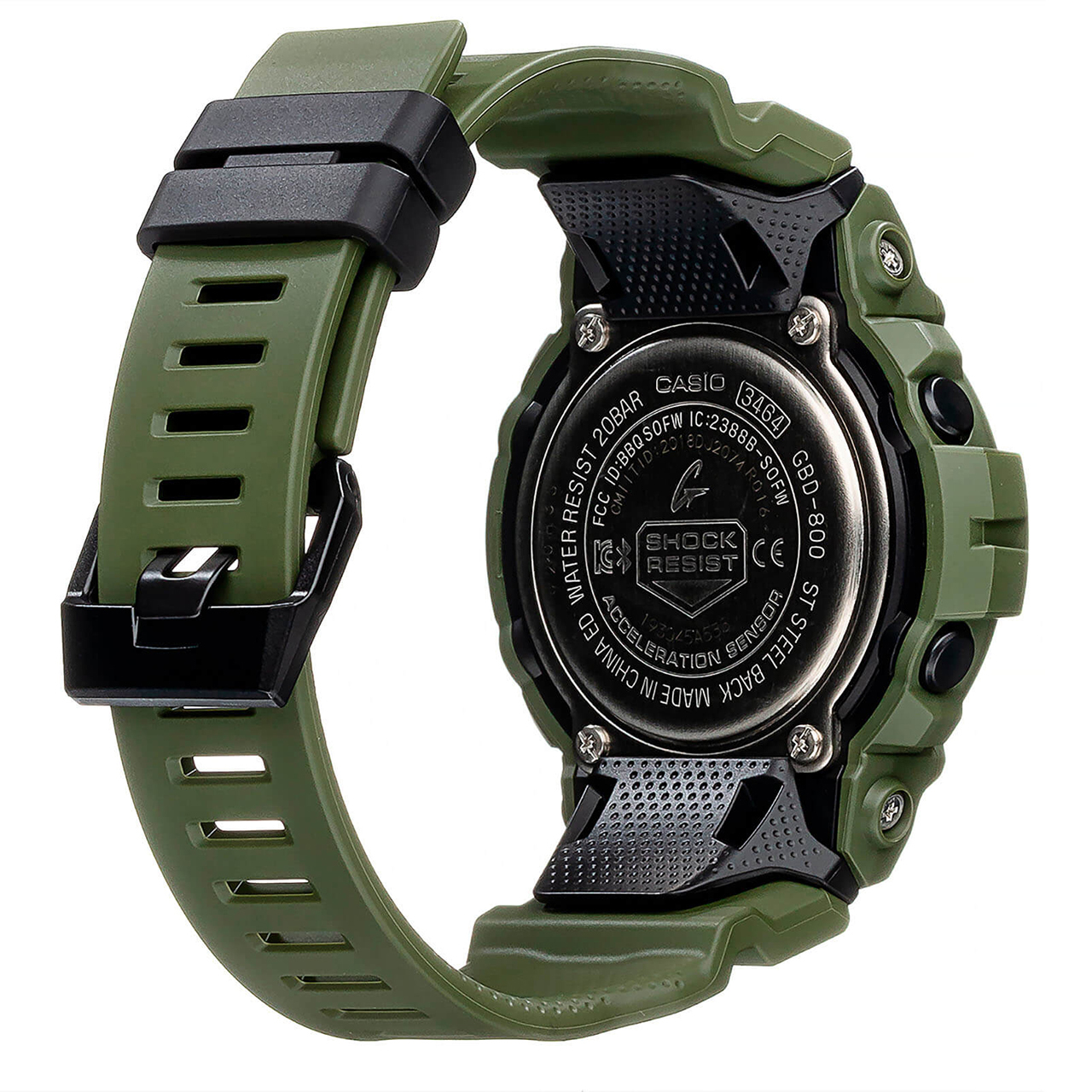 Корпус: Противоударный корпус матового цвета хаки из полимерного материала с высоким безелем, дополнительно защищающим закаленное минеральное стекло. Корпус защищён от повреждений и деформаций при ударах. Высококонтрастный LCD-индикатор циферблата оснащен автоматической электронной подсветкой, которая активируется поворотом кисти. Цвет подсветки белый. Модели этой серии оснащены многосегментными цифровыми дисплеями для улучшения читаемости. Цифровой дисплей разделен на верхнюю и нижнюю секции, в правом верхнем углу находится цифровой диск. Каждая область отображения показывает различные измерения, хронометраж и другую информацию, которая предоставляет полезные данные о вашей повседневной деятельности. Размер 48,6 мм x 54,1 мм х 15,5 мм. Водозащита 200 метров.