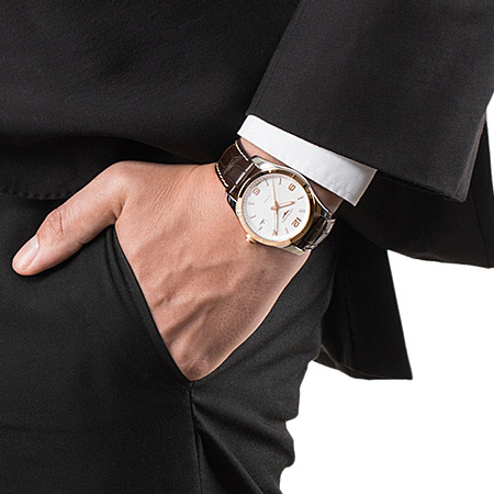 Корпус: Нержавеющая сталь/розовое золото, сапфировое стекло с антибликовым покрытием. Диаметр 40 мм, водонепроницаемость 50 метров. Циферблат – белый.