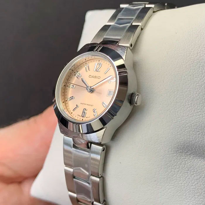 Корпус: Корпус изготовлен из гипоаллергенной латуни. Розовый циферблат с метками в виде арабских цифр. Прочное минеральное стекло обеспечит защиту часов от повреждений. Диаметр: 27 мм. Водонепроницаемость: 30 м.