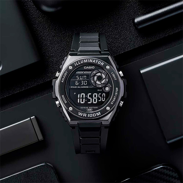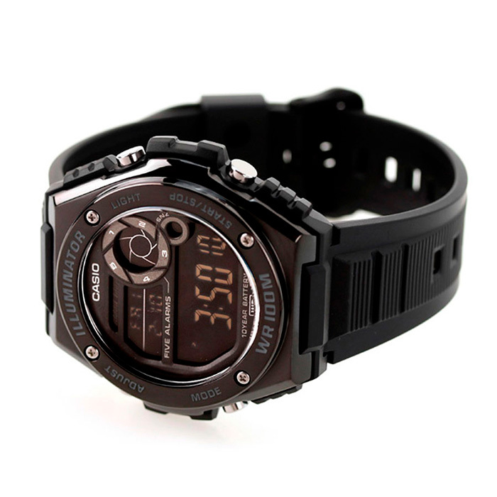 Функции: Электронный ЖК дисплей. Часы, минуты, секунды, pm, месяц, дата, день недели. Хронограф, таймер, мировое время, 12/24-часовое отображение времени, автоматический календарь. Почасовой сигнал времени, 5 многофункциональных будильников (с повтором будильника).