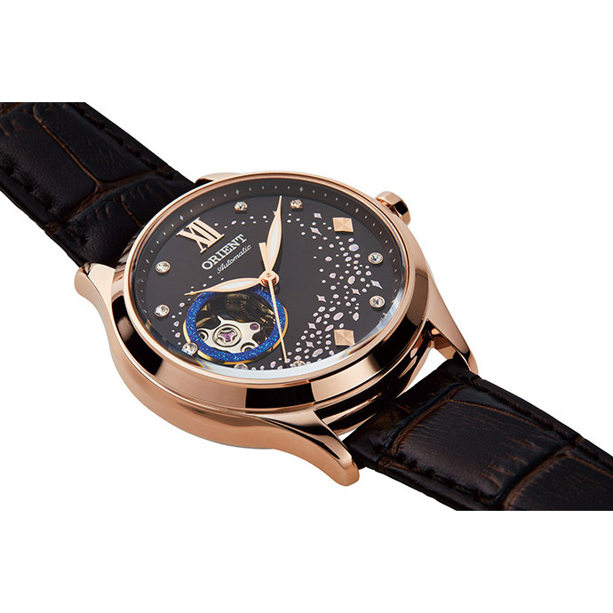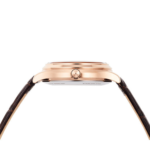 Корпус: Корпус выполнен из нержавеющей стали с IP-покрытием. Коричневый циферблат. Римская цифра в отметке "12 часов", синий ореол вокруг открытого баланса и ромбовидный узор у отметки "6 часов". Позолоченные стрелки и часовые индексы. Минеральное стекло. Прозрачная задняя крышка. Корпус диаметром 35,9 мм. Водозащита 30 WR.