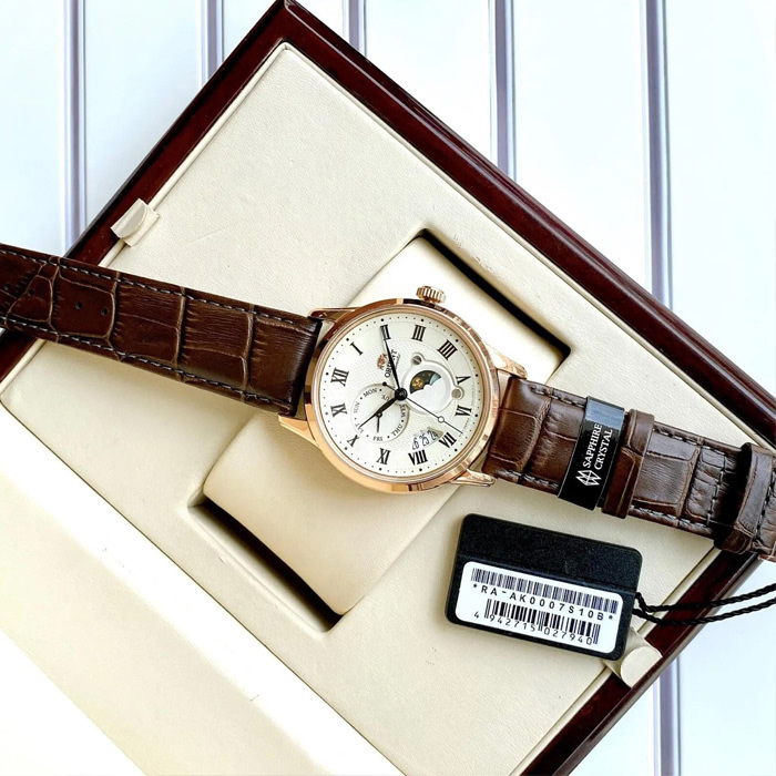 Корпус: Корпус из высококачественного стального сплава с высокими антикоррозийными свойствами и IP покрытием. Циферблат цвета слоновой кости украшен рельефным декоративным узором. Узкие листовидные стрелки в стиле Feuille. Метки в виде римских цифр. Сапфировое стекло устойчивое к царапинам. Завинчивающаяся прозрачная задняя крышка. Диаметр корпуса: 42,5 мм. Толщина: 14 мм. Водонепроницаемость: 50 м.