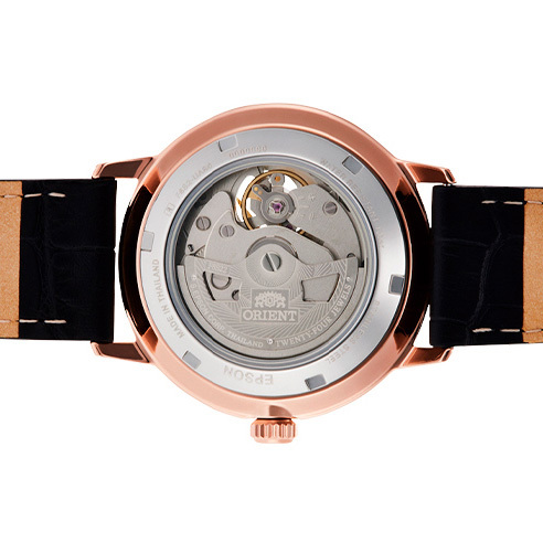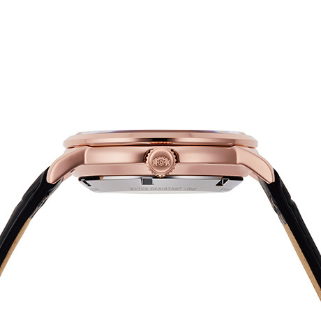 Корпус: Нержавеющая сталь с PVD покрытием цвета розового золота. Сапфировое стекло устойчивое к царапинам. Черный циферблат двухслойный, что придает ему объемный вид и привлекает внимание к движению часовой и минутной стрелок. Прозрачная винтовая задняя крышка. Водозащита - 100 метров. Диаметр 40 мм.