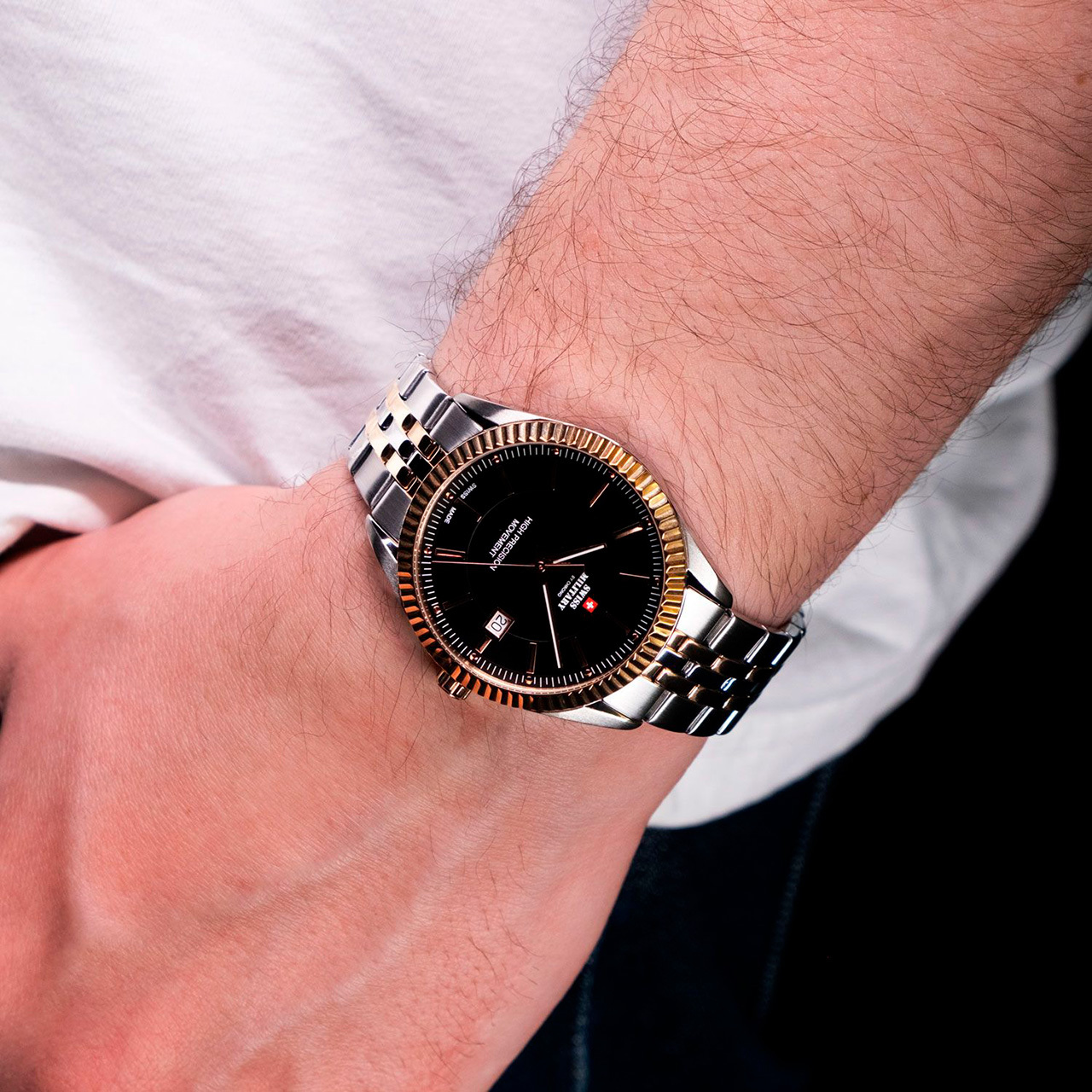 Корпус: Корпус выполнен из нержавеющей стали с частичным PVD покрытием цвета розового золота. Чёрный циферблат. Минеральное стекло с сапфировым покрытием. Водонепроницаемость 50 метров. Диаметр 40 мм.
