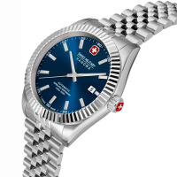 Корпус: Круглый корпус выполнен из нержавеющей стали 316. Рифленый безель. Циферблат синего цвета выполнен по технологии Sunray (солнечные лучи) и защищен прочным сапфировым стеклом. Метки в виде штрихов, фирменный логотип Swiss Military Hanowa в положении 12 часов. Стрелки и метки с люминесцентным покрытием, которое светится в темноте после непродолжительной зарядки на свету. Завинчивающаяся задняя крышка с сапфировым стеклом. Рифленая заводная головка украшена фирменным логотипом. Диаметр 41 мм. Водонепроницаемость 100 м.