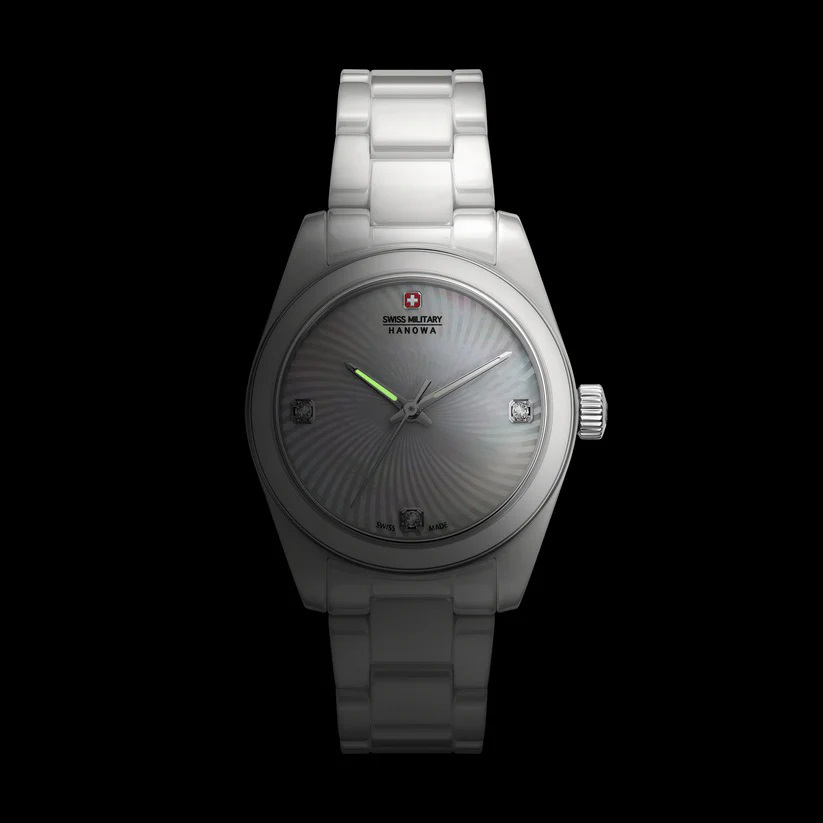 Корпус: Круглый корпус из керамики белого цвета. Белый перламутровый циферблат, украшен тремя искусственными бриллиантами. Стрелки с люминесцентным покрытием, которое светится в темноте после непродолжительной зарядки на свету. Сапфировое стекло устойчивое к появлению царапин, обладающее высокой прозрачностью. Диаметр: 31,5 мм. Водонепроницаемость: 50 м.