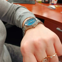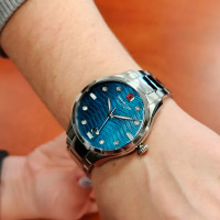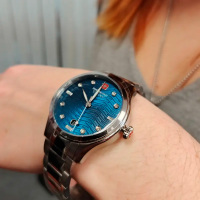 Корпус: Корпус выполнен из нержавеющей стали 316L, поверхности с матовой шлифовкой (сатинирование) и полировкой до зеркального блеска. Циферблат перламутровый синий. Серебристые метки выполнены в виде штрихов и инкрустированных кристаллами точек. Стрелки с люминесцентным покрытием, которое светится в темноте после непродолжительной зарядки на свету. Сапфировое стекло с повышенной устойчивостью к возникновению царапин. Задняя крышка имеет винтовое соединение с корпусом. Диаметр корпуса составляет 38 мм. Водостойкость 50 метров.