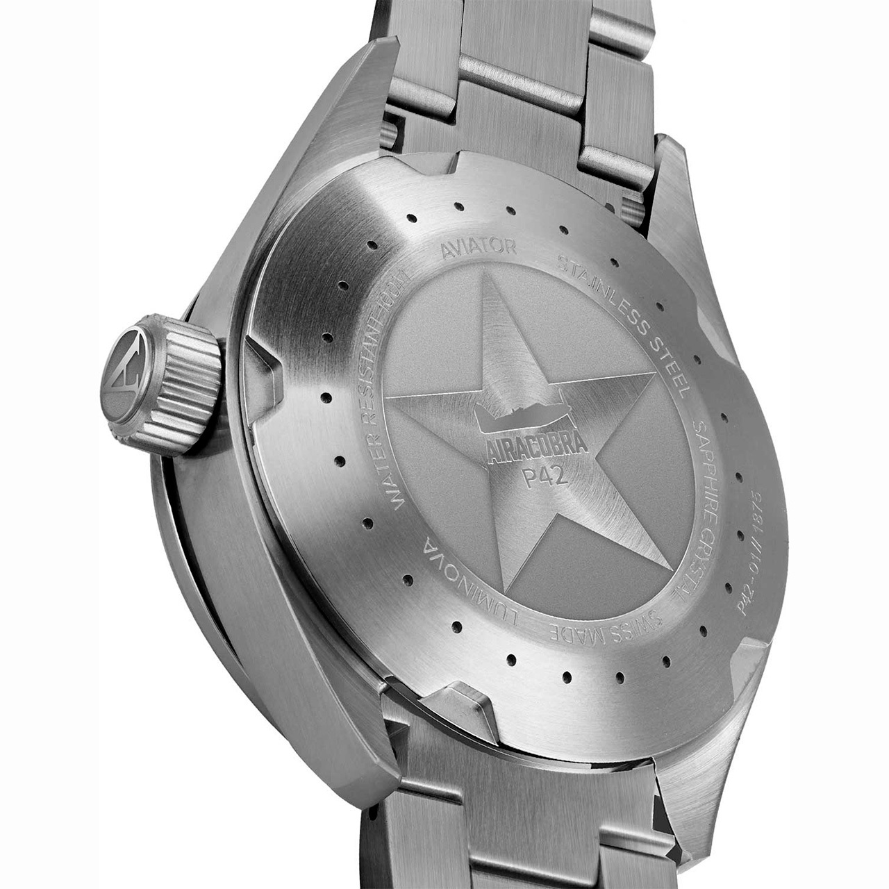 Корпус: Корпус выполнен из высококачественной стали марки 316L с повышенной устойчивостью к коррозии, поверхности с матовой шлифовкой – сатинированием. Матовый циферблат с зернистой отделкой имеет окраску серого цвета. Черные часовые метки и цифры в стиле “пилот” выполнены методом печати. Стрелки и часовые метки благодаря яркому люминесцентному покрытию SuperLuminova отлично читаются в полнейшей темноте и в условиях слабой освещенности. Сапфировое стекло с двусторонним антибликовым покрытием имеет повышенную устойчивость к возникновению царапин. Переводная коронка с двойным уплотнителем и винтовой фиксацией для дополнительной защиты от попадания воды внутрь корпуса. Задняя крышка имеет резьбовое соединение с корпусом. В оформлении задней крышки использована стилизация под элементы дизайна самолетов Airacobra. Диаметр корпуса составляет 42 мм, толщина - 12,2 мм. Водостойкость 100 метров (10 АТМ).