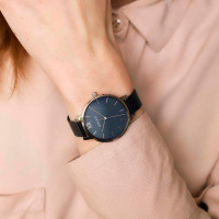 Корпус: Нержавеющая сталь 316L. Синий циферблат с серебристыми стрелками. Минеральное стекло повышенной прочности. Водозащита: 30 м. Диаметр: 34 мм.
