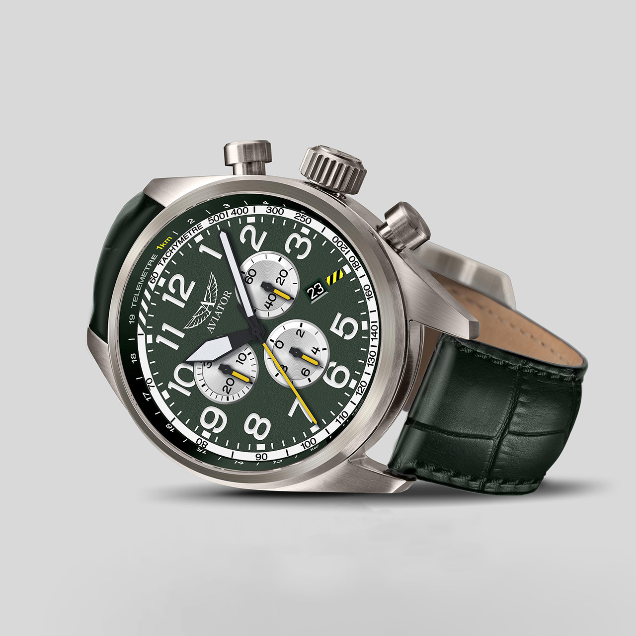 Корпус: Корпус модели выполнен из высококачественной стали с повышенной устойчивостью к коррозии марки 316L. Циферблат зелёного цвета, чёрные стрелки. Цифры в стиле “пилот” выполнены методом печати. Стрелки и метки с покрытием SuperLuminova, отлично читаются в полнейшей темноте и в условиях слабой освещенности. Сапфировое стекло с антибликовым покрытием. Переводная коронка с двойным уплотнителем, винтовой фиксацией и увеличенного размера для удобства вращения рукой в летной перчатке с гравировкой в виде буквы «A». Диаметр 45 мм. Водозащита 100 метров.