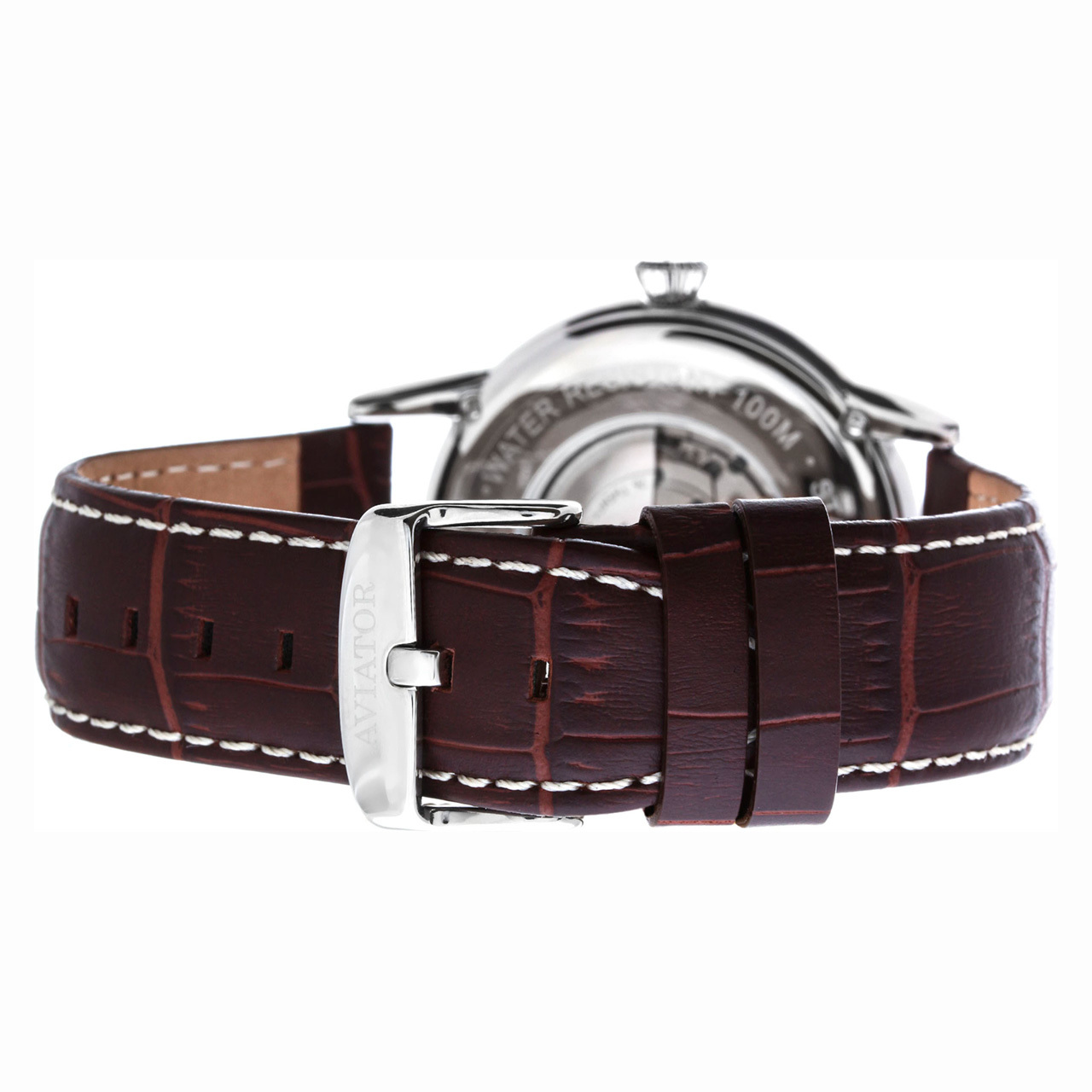 Ремешок: Коричневый ремешок из телячьей кожи с тиснением под аллигатора, контрастная прошивка по краю, ширина 22/20 мм. Браслетная застежка из нержавеющей стали, раскладывающаяся при нажатии кнопок двойной блокировки.