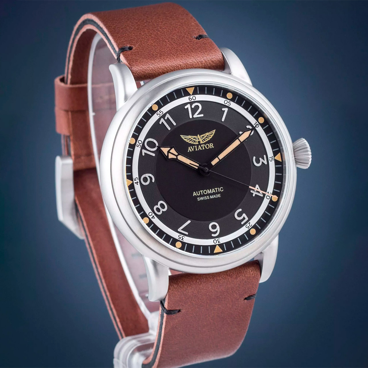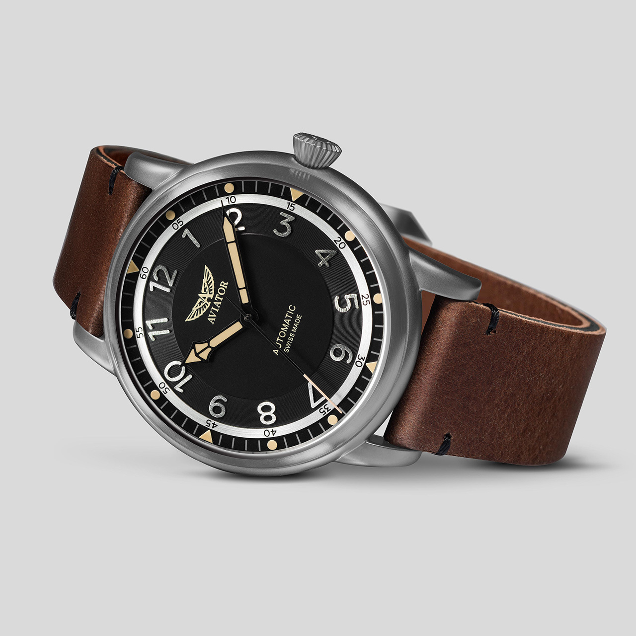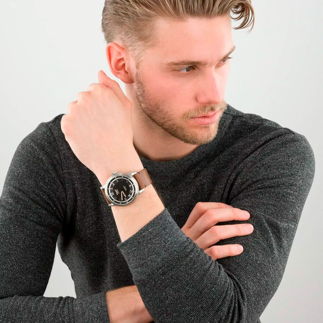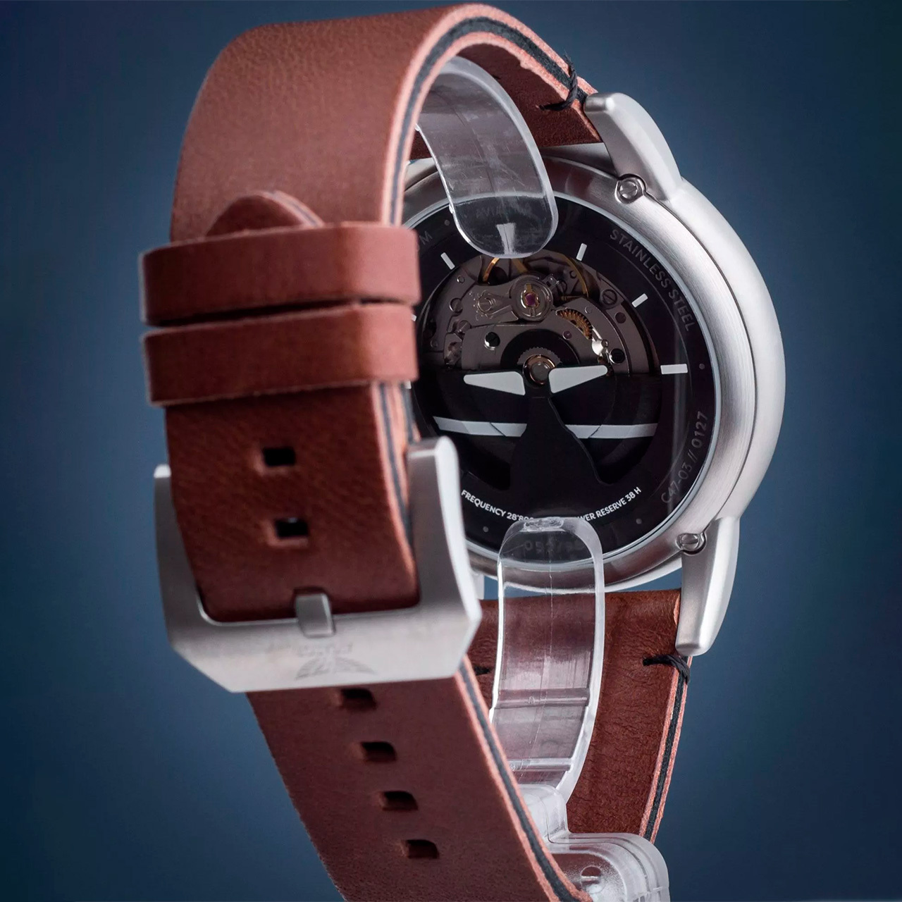 Корпус: Нержавеющая сталь марки 316L.Циферблат в стиле “пилот” черного цвета. Аппликация цифр в ретро-стиле и печатная разметка. «Соборные» стрелки и часовые метки имеют светящееся в темноте люминесцентное покрытие SuperLuminova. Сапфировое стекло с антибликовым покрытием. Переводная коронка с двойным уплотнителем для дополнительной защиты. Задняя крышка с прозрачным окном из сапфирового стекла имеет винтовое соединение с корпусом. В оформлении задней крышки использована стилизация под авиагоризонт. Метки на крышке корпуса и оформление ротора автоподзавода имитируют один из самых важных приборов из кабины самолета Douglas Dakota C-47, который контролирует положение самолета относительно поверхности Земли. Водонепроницаемость 100 метров. Диаметр 45 мм.
