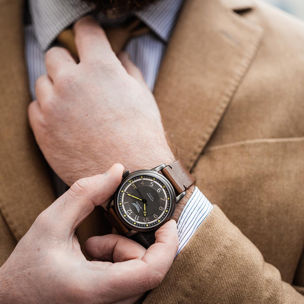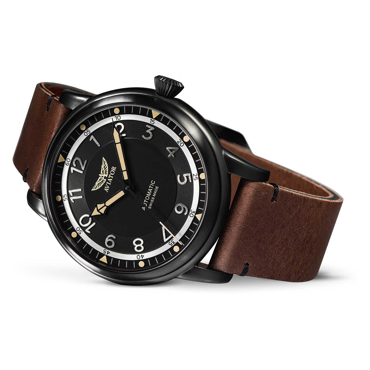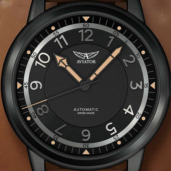 Корпус: Нержавеющая сталь марки 316L с PVD покрытием чёрного цвета. Циферблат в стиле “пилот” черного цвета. Аппликация цифр в ретро-стиле и печатная разметка. «Соборные» стрелки и часовые метки имеют светящееся в темноте люминесцентное покрытие SuperLuminova. Сапфировое стекло с антибликовым покрытием. Переводная коронка с двойным уплотнителем для дополнительной защиты. Задняя крышка с прозрачным окном из сапфирового стекла имеет винтовое соединение с корпусом. Прозрачная задняя крышка украшена имитацией функции контроля управления хвоста самолета. Ротор механизма указывает на градусы, как в авиационном приборе триммер. Водонепроницаемость 100 метров. Диаметр 45 мм.