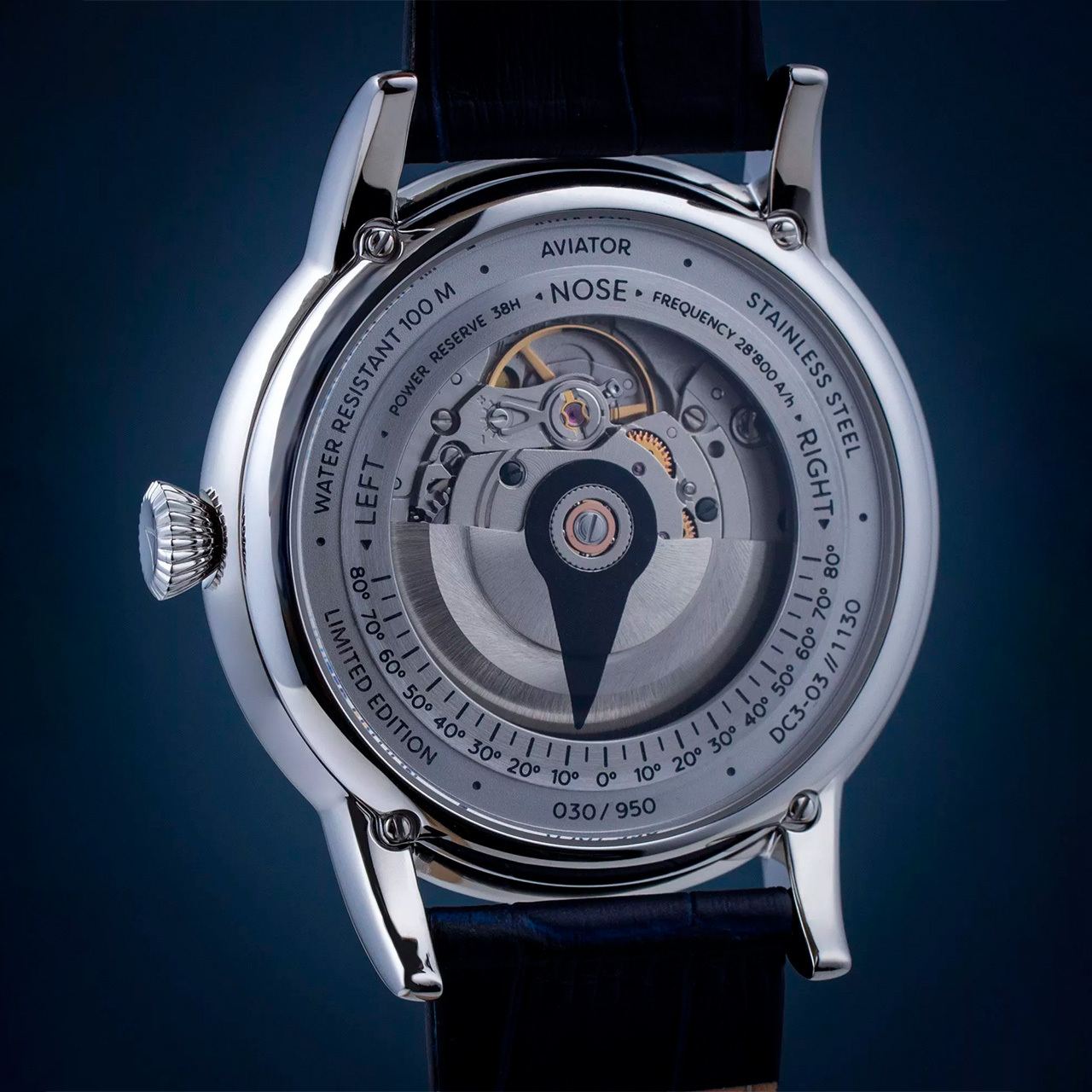Корпус: Нержавеющая сталь марки 316L. Объемный циферблат с центральной частью серебристого цвета. Стрелки и часовые индексы покрыты люминесцентным составом SuperLuminova. Сапфировое стекло с антибликовым покрытием. Переводная коронка с двойным уплотнителем для дополнительной защиты. Задняя крышка с прозрачным окном из сапфирового стекла имеет винтовое соединение с корпусом. В оформлении задней крышки использована стилизация под один из инструментов управления из кабины самолета Douglas DC-3. Гравировка с градусами на крышке корпуса и стрелка на роторе автоподзавода имитируют функцию угла перекладки руля, которая контролирует положение передней и задней частей самолета. Водонепроницаемость 100 метров. Диаметр 45 мм.
