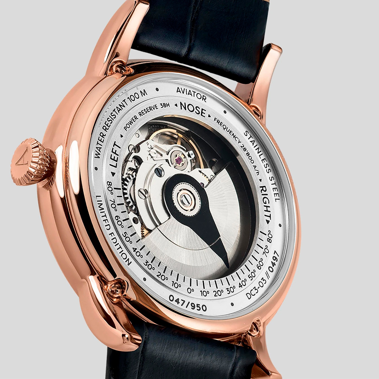 Корпус: Нержавеющая сталь марки 316L с розовым PVD покрытием. Объемный циферблат чёрного цвета с различной финишной обработкой: в центральной части шлифовка в стиле «солнечные лучи», окруженная гильошированием в виде тонких концентрических линий. Стрелки и часовые индексы покрыты люминесцентным составом SuperLuminova. Сапфировое стекло с антибликовым покрытием. Переводная коронка с двойным уплотнителем для дополнительной защиты от попадания воды внутрь корпуса. Задняя крышка с прозрачным окном из сапфирового стекла имеет винтовое соединение с корпусом. В оформлении задней крышки использована стилизация под один из инструментов управления из кабины самолета Douglas DC-3. Гравировка с градусами на крышке корпуса и стрелка на роторе автоподзавода имитируют функцию угла перекладки руля, которая контролирует положение передней и задней частей самолета. Водонепроницаемость 100 метров. Диаметр 45 мм.