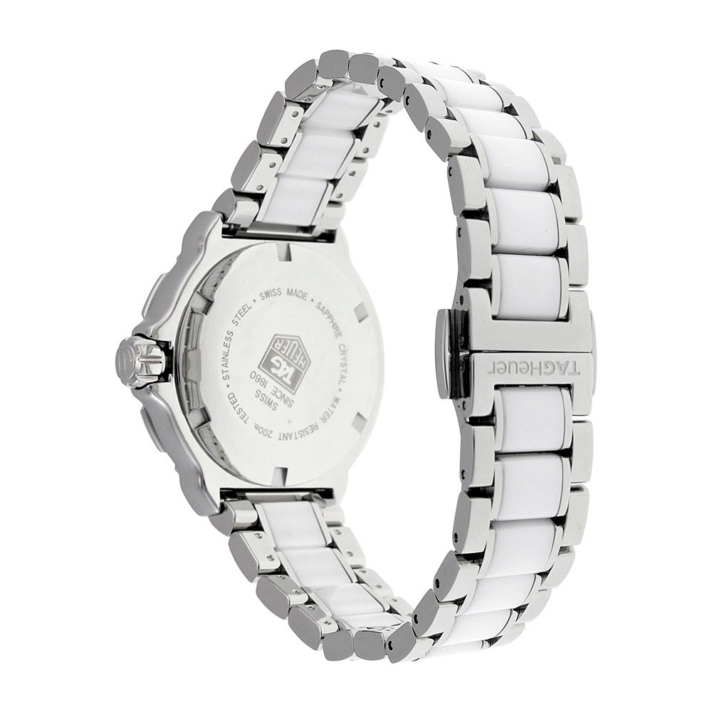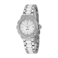 Корпус: Нержавеющая сталь. Стальной безель украшен белой керамической вставкой и 120 бриллиантами. Сапфировое стекло. Завинчивающаяся заводная коронка, водонепроницаемость 200 метров. Диаметр 37 мм.