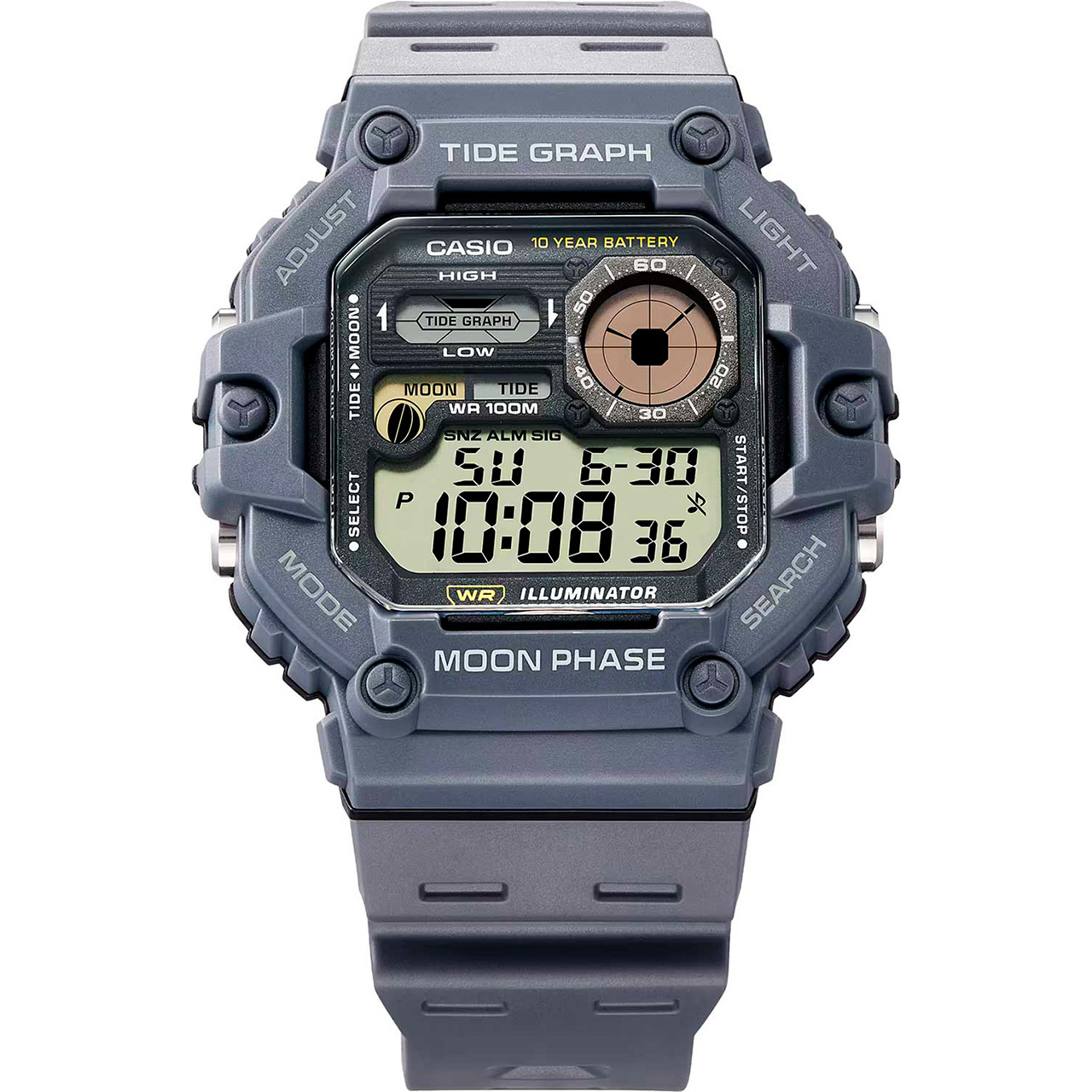 Функции: Часы с цифровым отображением времени. Циферблат подсвечивается светодиодом. Настраиваемое послесвечение 1,5 или 3сек. Цвет подсветки: оранжевый. Второй часовой пояс. Отображение возраста Луны на определенную дату и графика фаз Луны. Отображение сведений о приливах и отливах на заданную дату и время. 12-ти и 24-х часовой формат времени. Секундомер с точностью показаний 1/100с и временем измерения 24ч. SPLIT-хронограф. Таймер обратного отсчета от 1 мин. до 24 ч. с автоповтором. Функция включения/отключения звука. Типы сигналов будильника: ежедневный, ежемесячный, каждый день определенного месяца, на определенную дату. 3 будильника, один с функцией Snooze, ежечасный сигнал. Батарея рассчитана на 10 лет.